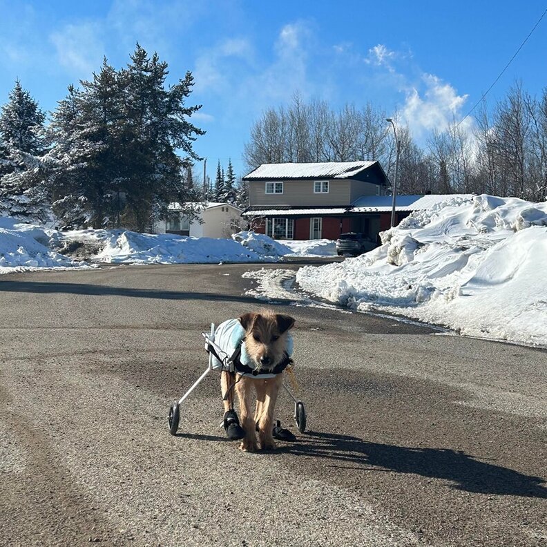 Winnie is thriving in her new home and loves exploring Newfoundland’s beautiful landscape with the help of her very own wheelchair. No matter the weather, Winnie is always ready to seize the day and show her team of rescuers how grateful she is to have been saved.