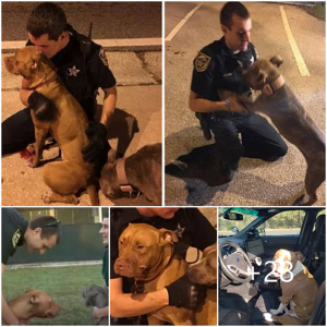 Two stranded Pit Bulls are gently accompanied by officers, who sit with them patiently, providing comfort as they await help. -dtht